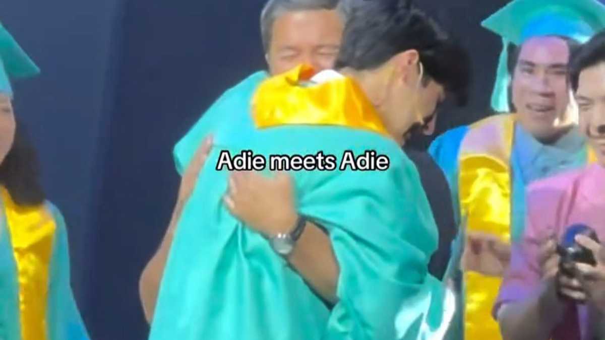 - The father and son were seen hugging on stage as the crowd cheered for the original and the new "Adie"